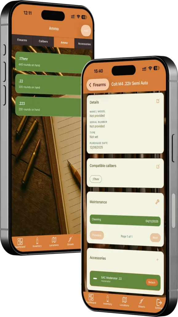 Your complete shooting inventory at your fingertips. Start by adding the calibres you shoot, then log your ammunition stock for each one – track quantities so you always know what’s on hand before heading to the range. Beyond ammo, the accessories section lets you catalogue everything else in your kit. Scopes, bipods, moderators – if it’s part of your shooting setup, you can track it.