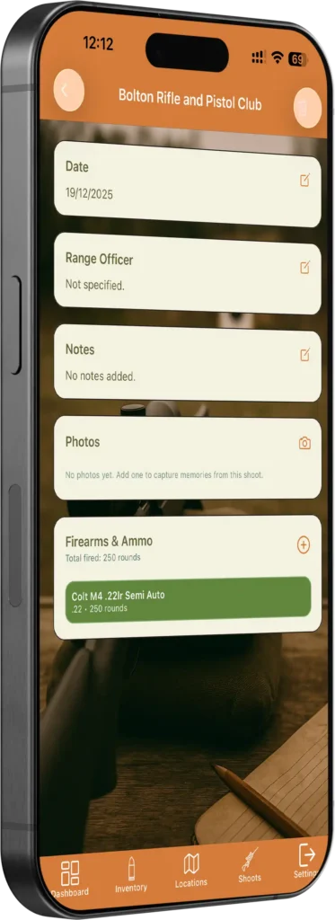 Log every range visit and hunting shoot with all the details that matter. Record which firearms you used, how many rounds fired, where you shot, weather conditions, and when. Add notes about performance or anything worth remembering for next time. Over time, you’ll build up a complete history of your shooting sessions – perfect for tracking how much you’re shooting each gun, monitoring ammunition usage, or demonstrating regular use for your FAC records. It’s your personal shooting diary and range log book, always up to date and always with you.